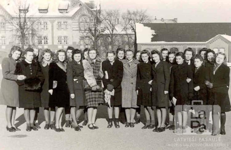 Lībekas Latviešu ģimnāzijas audzēknes ar klases audzinātāju Mēsenes nometnē Lībekā (angļu zonā). Jaunu sieviešu grupa mēteļos stāv laukumā. Fonā ir divas mūra ēkas. No kreisās: piektā Tamāra Elstiņa, sestā Skaidrīte Klezberga, septītā Dzidra Lazdiņa, divpadsmitā ? Delle (skolotāja), piecpadsmitā Ārija Dāboliņa, sešpadsmitā Ilze Ekmanis, septiņpadsmitā Biruta Mikus, astoņpadsmitā Vilhelmīne Pelše.