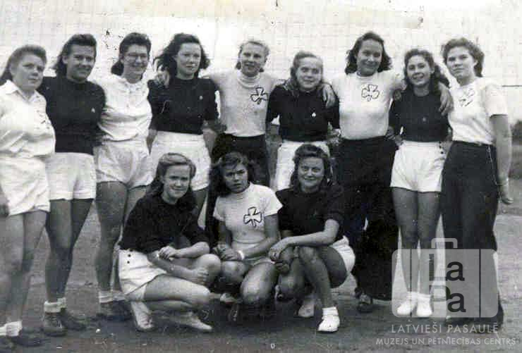 Divu komandu sportistes volejbola sacensībās Pinnebergā (angļu zonā). Jaunietes divās rindās pārmaiņus gaišos un tumšos kreklos. Lībekas nometnes komanda ir tumšos kreklos, bet Pinnebergas nometnes komanda ir gaišos kreklos. Priekšā tupus sēž, no kreisās: pirmā Ilona Engele un trešā Dzidra Lazdiņa. Aizmugurē stāv, no kreisās: nezināms, Biruta Mikus, nezināms, Vija Blumfelde (pr. Mangule), Maija Zariņa, Edīte Balode, Vija Taube, Aina Prauliņa un Mirjama Plensnere.