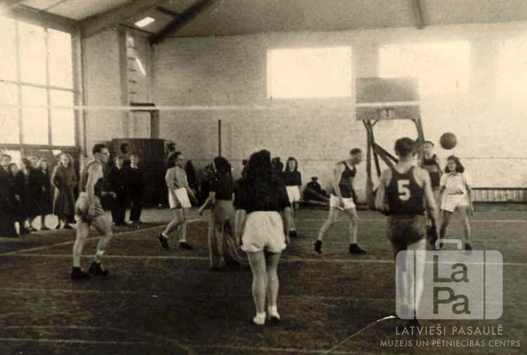 Volejbola sacensības iekštelpās Lībekā (angļu zonā). Divas jauniešu komandas spēlē volejbolu sporta zālē ar augstiem griestiem. Starp komandām ir tīkls. Fonā kreisajā pusē stāv skatītāji. Laukuma galā ir basketbola grozs. Redzami vairāki lieli telpas logi.