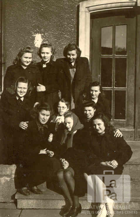 Neištates ģimnāzijas (Holšteinā, angļu zonā) internāta 49. istabas skolnieču grupa pie mūra ēkas ieejas durvīm ar stikla rūtīm. Jaunietes, ģērbušās mēteļos, vairākās rindās; priekšā skolnieces sēž uz kāpnēm. Pirmajā rindā, trešā no kreisās: Anita Rituma. Otrajā rindā, otrā no kreisās: Skaidrīte Klezberga. Trešajā rindā, no kreisās: Tamāra Elstiņa un Ilze Ekmane. Aizmugurē stāv, otrā no kreisās: Vīta Kande.