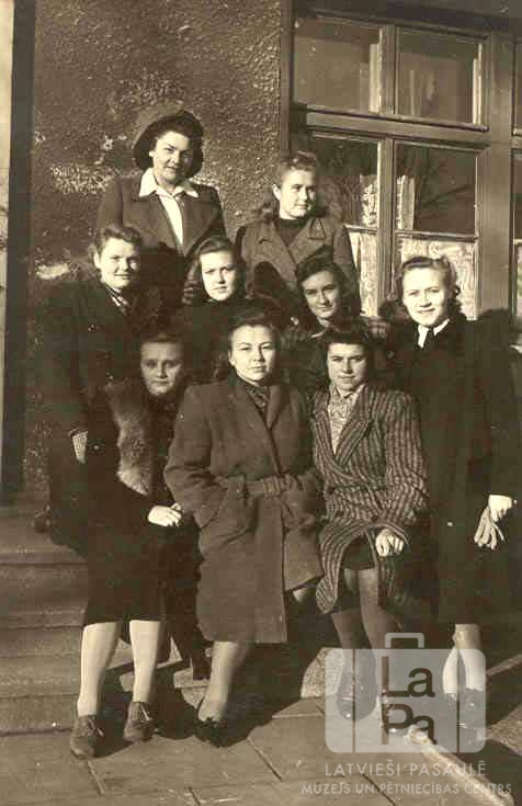 Neištates ģimnāzijas (Holšteinā, angļu zonā) internāta audzinātāja ar internāta 53. istabas skolnieču grupu pie mūra ēkas. Visas ir ģērbušās mēteļos. Priekšā jaunietes sēž uz ēkas pakāpieniem. Aizmugurē ir ēkas logs. Pirmajā rindā, no kreisās: pirmā Ērika Sakalova un trešā Skaidrīte Klezberga. Otrajā rindā, no kreisās: nezināms, Tamāra Elstiņa, Ilze Ekmane un Vīta Kande. Trešajā rindā, pirmā no kreisās: ? Plauka.