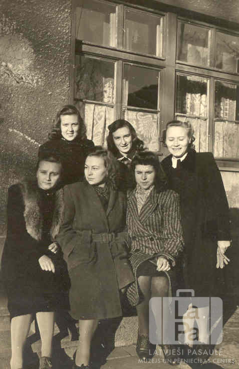 Neištates ģimnāzijas (Holšteinā, angļu zonā) skolnieču grupa pie mūra ēkas. Visas ir ģērbušās mēteļos. Priekšā jaunietes sēž uz ēkas pakāpieniem. Fonā ir ēkas logs. Pirmajā rindā, no kreisās: pirmā Ērika Sakalova un trešā Skaidrīte Klezberga. Otrajā rindā, no kreisās: Tamāra Elstiņa, Ilze Ekmane un Vīta Kande.