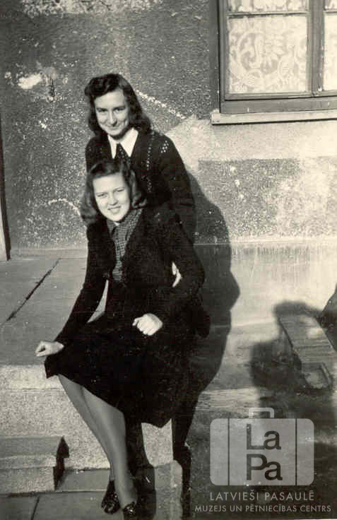 Divas Neištates ģimnāzijas (Holšteinā, angļu zonā) internāta 53. istabas skolnieces sēž uz mūra ēkas lieveņa. Fonā ir ēkas logs. No priekšas: Tamāra Elstiņa un Ilze Ekmane.