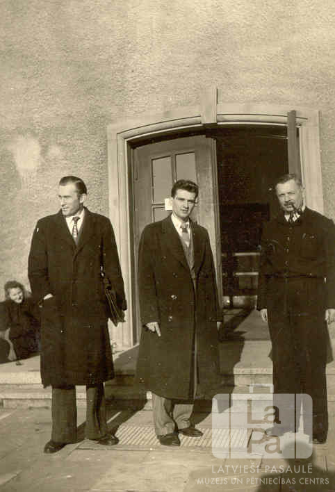 Trīs vīrieši mēteļos stāv mūra ēkas atvērtu ieejas durvju priekšā Neištates ģimnāzijas (Holšteinā, angļu zonā). Viens vīrietis rokā tur portfeli. Aizmugurē kreisajā pusē ir redzama sēdoša jauniete. Trešais no kreisās: ? Vītiņš (ģimnāzijas direktors).