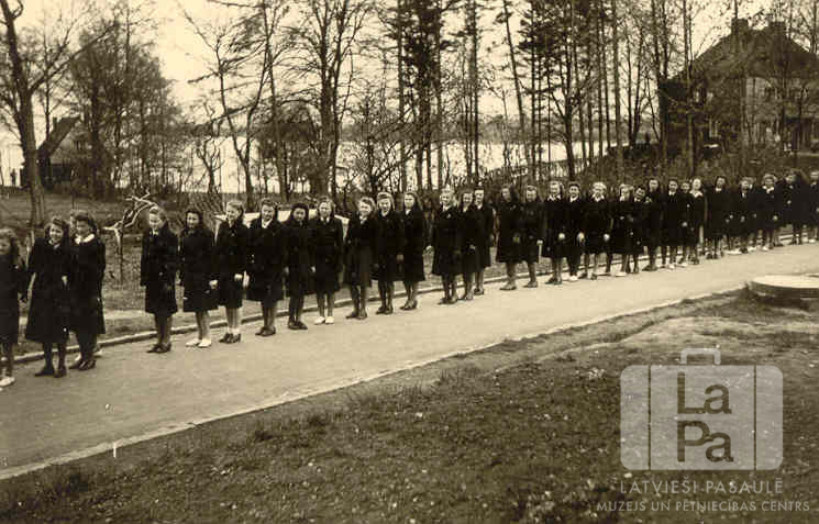 Neištates ģimnāzijas skolnieces stāv garā godasardzē, sagaidot Latvijas sūtni Lielbritānijā Kārli Zariņu viņa vizītes laikā Neištates nometnē (Holšteinā, angļu zonā). Fonā caur kokiem ir redzamas nometnes ēkas un, iespējams, arī ūdenstilpe. No kreisās puses: sestā Ilona Lūkina, septītā Dzidra Lazdiņa, astotā Vija Vilde, devītā Mirdza Jaunzeme, desmitā Velta Akmentiņa, vienpadsmitā Vija Bangerska, divpadsmitā Ārija Runģe, trīspadsmitā Tamāra Elstiņa, četrpadsmitā Ilze Ekmane, piecpadsmitā Vija Blumfelde (pr. Mangule), sešpadsmitā Astra Riša un divdesmitā Edīte Balode.