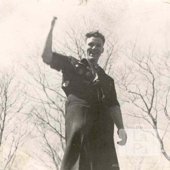 Staburaga 1. skautu vienības rovers Arnis Zēbergs mežā aiz Mēsenes nometnes Lībekā (angļu zonā). Jaunietis formastērpā stāv ar paceltu roku. Fonā ir koki bez lapām.
