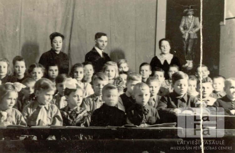 Pamatskolas skolotāji un skolēni Sidrabenes nometnē Lībekā (angļu zonā). Priekšā koka solu rindās sēž mazi bērni. Aizmugurē stāv trīs skolotāji. Fonā labajā pusē uz sienas ir vīrieša zīmējums. Pāri fotogrāfijai labajā pusē stiepjas gaiša svītra. Pirmajā rindā, no kreisās: otrā Inese Liepiņa, trešā Biruta Ošiņa. Otrajā rindā, no kreisās: otrais Juris Blumfelds, ceturtais Imants Bahmuts, piektais Jānis Strods un sestais Druvalds Liepiņš. Aiz otrās rindas skolēnu vidū sēž, no kreisās: Biruta Saliņa, Aina Ošiņa, Lija Čūle, Marija Jesčenko, Ilga Nātre, Vija Blumfelde (pr. Mangule), Mirdza Linkaite, Ēriks Čūls, Vilnis Matisons, Indulis Liepiņš, Guntis Nātre, Kārlis Riekstiņš, Maigonis Krūmiņš, Arnis Mikus un ? Priede. Aizmugurē stāv skolotāji, no kreisās: Bētiņa jaunkundze, ? Izands un Izanda kundze.