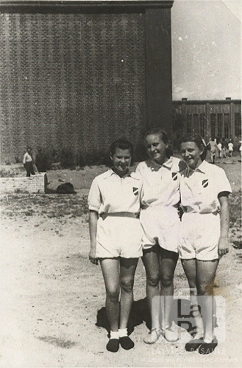 Trīs jaunietes gaišos sporta tērpos stāv pie fabrikas ēkas Švarcenbekā (angļu zonā). Fonā pie augstās ķieģeļu mūra ēkas pastaigājas cilvēki. Priekšā stāv, no kreisās: Spodra Čemere, Lidija Blūmentāle un Vija Vilde (pr. Mežnora).