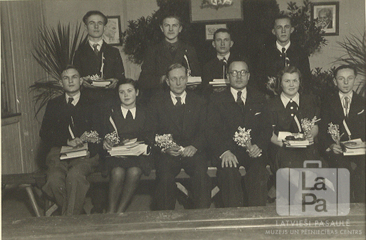 Švarcenbekas nometnes (angļu zonā) tautskolas 3. (pēdējais) izlaidums. Skolēni ar skolotājiem divās rindās iekštelpās, ar ziediem un grāmatām rokās. Pirmā rinda sēž uz koka sola. Fonā telpa ir dekorēta ar augiem. Pie aizmugurējās sienas ir divi portreti; iespējams, labajā pusē ir Raiņa portrets. Sienas vidū ir redzama Latvijas Valsts ģerboņa apakšējā daļa. Pirmajā rindā, no kreisās: Miroslavs Daņilovičs, Vija kalniņa, Olģerts Zubkovs (klases audzinātājs), Albīns Banga (skolas pārzinis), Valda Brakovska un Jānis Ozoliņš. Otrajā rindā, no kreisās: Romans Bērziņš, Arvīds Avens, Richards Štubis un Aivars Kalniņš.