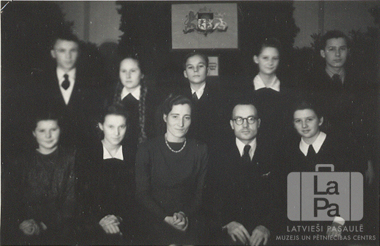 Švarcenbekas nometnes (angļu zonā) tautskolas 2. izlaidums. Skolotāji un skolēni divās rindās. Fonā pie sienas ir Latvijas Valsts ģerbonis. Pirmajā rindā, no kreisās: Spodra Čemere, Mirdza Pole, Lauma Skujiņa (klases audzinātāja), Albīns Banga (skolas pārzinis) un Vija Vilde (pr. Mežnora). Otrajā rindā, no kreisās: Gunārs Kalniņš, Lidija Blūmentāle, Ivars Sīpols, Ausma Druvaskalns un Leonīds Daģis.