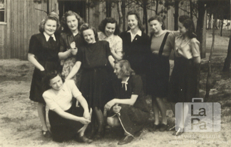 Saules ģimnāzijas internāta 2. istabas meitenes Saules nometnē (angļu zonā) 1947. g. vasarā. Fonā ir tievs koku puduris un koka dēļu ēka. Priekšā sēž, no kreisās: Ausma Allena un Silvija Rence. Aizmugurē stāv, no kreisās: Zigrīda Gludava, Astra ?, Eleonora Avena, Aina Kalnija, Silvija Sīpols, Vija Vilde (pr. Mežnora) un Rasma Liepiņa.