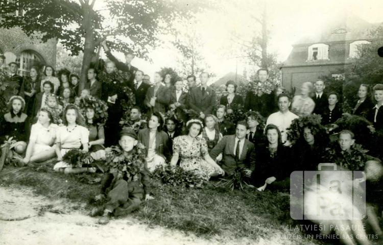 Ventas nometnes Šlēsvigā (angļu zonā) latvieši ir pulcējušies Jāņu vakara svinēšanai un sadziedāšanai. Liela cilvēku grupa vairākās rindās pie koka; daudziem cilvēkiem uz galvas un ap kaklu ir Jāņu vainagi. Fonā ir redzamas vairākas mūra ēkas.