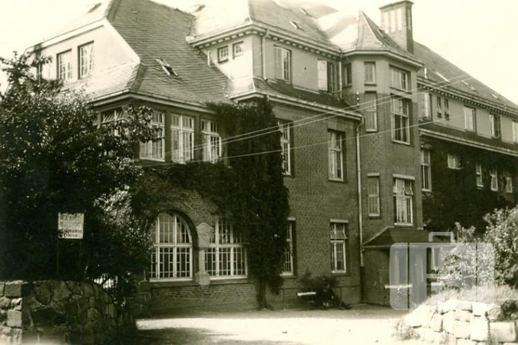 Ventas nometnes Šlēsvigā (angļu zonā) ēka, kas bija daļa no kādreizējā trako nama. Vīteņaugiem daļēji apaugusi trīsstāvu ķieģeļu ēka. Priekšplānā abās pusēs ir zems akmens mūris, kreisajā pusē ir krūms.