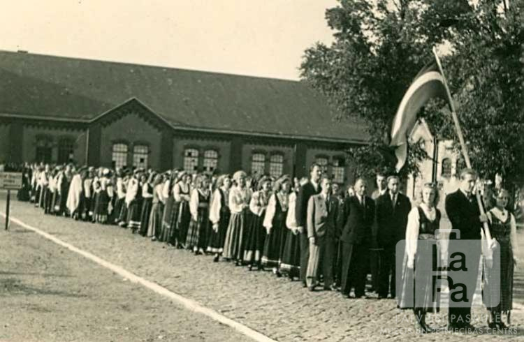 Eitīnes nometnes jauktais koris dziesmu dienu gājienā Mēsenes nometnē Lībekā (angļu zonā). Kora dalībnieki ir tērpušies tautastērpos. Priekšā stāv karognesējs ar Latvijas karogu. Fonā ir mūra ēka.