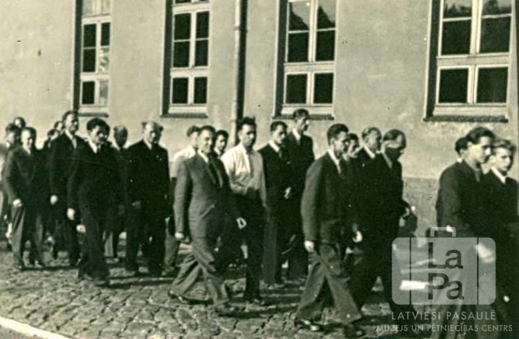 Eitīnes nometnes jauktais koris dziesmu dienu gājienā Mēsenes nometnē Lībekā (angļu zonā). Vīrieši uzvalkos un gaišos kreklos soļo pa bruģētu ielu garām mūra ēkai. Fonā ir četri ēkas logi.