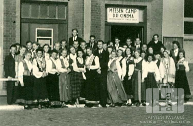 Eitīnes nometnes jauktais koris dziesmu dienā Mēsenes nometnē Lībekā (angļu zonā). Kora dalībnieki tautastērpos un uzvalkos stāv pie ķieģeļu mūra ēkas. Fonā virs ēkas ieejas ir uzraksts "MEESEN CAMP / D.P. CINEMA".