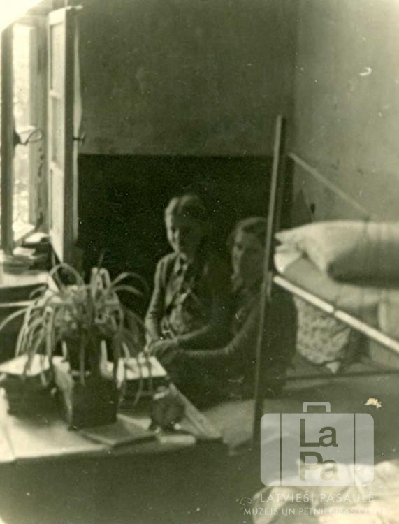 Irma Rituma kopā ar meitu sēž uz gultas pie Ritumu ģimenes istabas atvērta loga Eitīnes nometnē (angļu zonā). Meitene sēž mātei klēpī. Priekšplānā kreisajā pusē uz galda ir augs mazā vāzē, grāmatas un neliels pulkstenis. Priekšplānā labajā pusē, iespējams, ir divstāvu gulta. No kreisās: Vilma Rituma (pr. Bolšteina) un Irma Rituma. Par šo gadījumu Vilma Bolšteina (dz. Rituma) stāsta: "Es ar savu māti sēžam uz gultas pie mūsu istabas loga. Eitīnes DP nometnē istabas bija mazākas, tāpēc mūsu ģimenei bija pašiem sava istaba. Mazgāšanās un labierīcības gan bija kopējas."