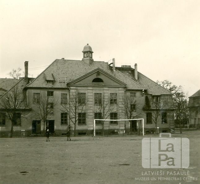 Pamatskolas divstāvu mūra ēka un futbola laukums ar vārtiem Eitīnes nometnē (angļu zonā) 1949. gada rudenī. Pa laukumu pastaigājas divi cilvēki. Ēkas priekšā, aiz futbola vārtiem, ir koku rinda bez lapām.