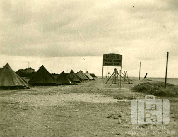 Telšu rinda bērnu vasaras nometnē pie Baltijas jūras netālu no Neištates (Holšteinā, angļu zonā). Labajā pusē ir zīme ar nesalasāmu uzrakstu. Pa labi no zīmes ir redzams jūras krasts.