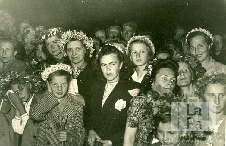 Sievietes un meitenes ar ziedu un ozzollapu vainagiem galvās Jāņu vakara svinību un sadziedāšanās laikā Neištatē (Holšteinā, angļu zonā). Grupas vidū stāv sieviete tumšā žaketē. Aizmugurē stāv jaunekļi.