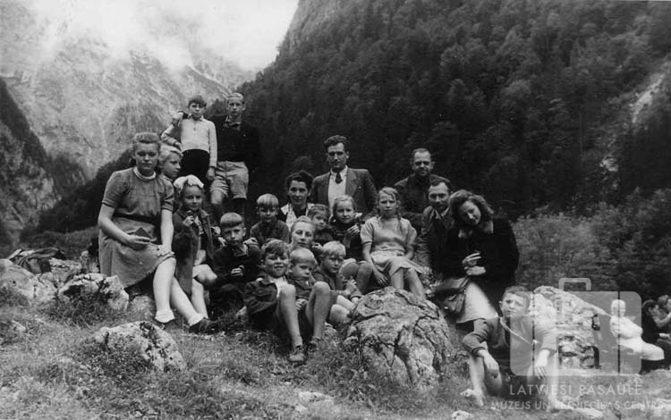 Cilvēku grupa no Denghofenes nometnes (amerikāņu zonā) sēž uz akmeņiem skolas izbraukuma laikā uz Kēnigszē ezeru ("Königsee"). Grupā ir skolēni, skolotāji un pavadoņi. Fonā ir mežainu kalnu ainava. Priekšpēdējā rindā vidū ir redzami: ? Dalberga (skolotāja), ? Dalbergs un ? Aldaris (nometnes administrators). Aizmugurē, pirmais no kreisās: Vilmārs Strautiņš (gaišā džemperī). Par šo gadījumu Vilmārs Strautiņš stāsta: "Esam apstājušies, lai nofotografētos, pirms tālāk došanās."