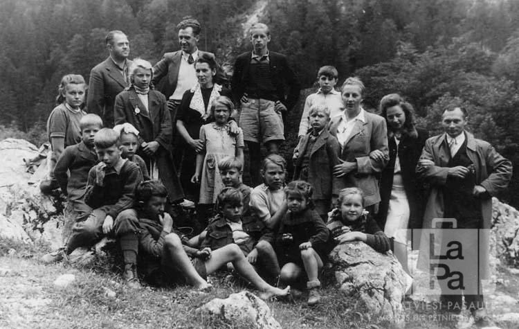 Cilvēku grupa no Denghofenes nometnes (amerikāņu zonā) skolas sēž uz akmeņiem pirmajā pēckara izbraukumā uz Bavārijas Alpiem pie Kēnigszē ezera ("Königsee"). Grupā ir skolēni, skolotāji un pavadoņi. Fonā ir mežainu kalnu ainava. Priekšpēdējā rindā vidū ir redzama: ? Dalberga (skolotāja tumšā apgērbā ar gaišu apkakli). Aizmugurē stāv, pirmais no kreisās: ? Dalbergs. Stāv, no labās: pirmais ? Aldaris (nometnes administrators), ceturtais Vilmārs Strautiņš (gaišā džemperī).