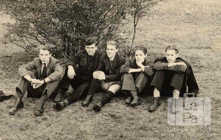 Piecu jaunekļu grupa atpūšas pie krūma pēc futbola spēles netālu no Baireitas nometnes (amerikāņu zonā) 1948. gada rudenī. Jaunekļi sēž rindā viens otram blakus. Četri ir ģērbušies uzvalkos, viens jauneklis ir formastērpā. No kreisās: Richards Kubuliņš, Juris Delle, Laimonis Opmanis, Vilmārs Strautiņš un Laimonis Krūmiņš.