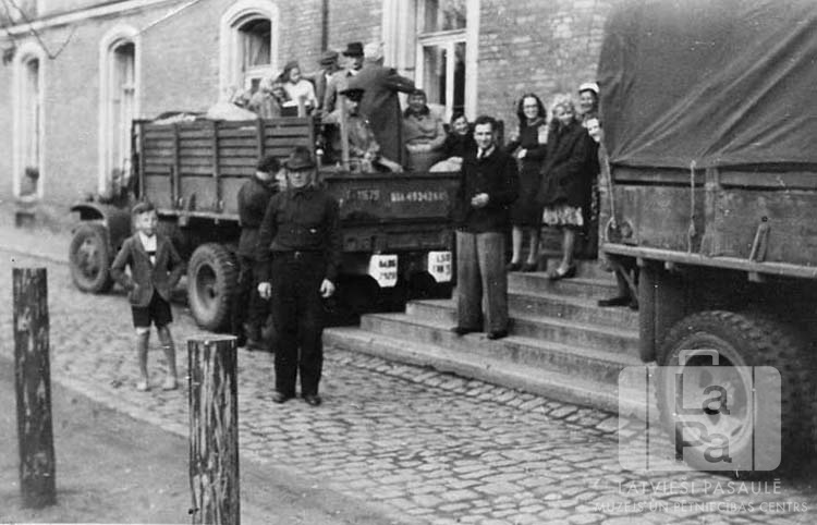 Cilvēki rosās ap divām smagajām automašīnām bruģētas ielas malā Bambergas nometnē (amerikāņu zonā) pārcelšanās laikā. Automašīnas ir novietotas ar kravas kastēm pret ķieģeļu mūra ēkas ieejas kāpnēm. Vienā automašīnā sēž arī cilvēki. Fotogrāfijas mugurpusē rakstīts: "Tas bija tad, kad Klūge ar Nikolajevu brauca uz Pegnicu." Foto autors: Nikolajs Pārups (cara armijas kapteinis). Uz ielas stāv, otrais no kreisās: Kārlis Strautiņš. Uz kāpnēm ir redzama: ? Zvejniece.