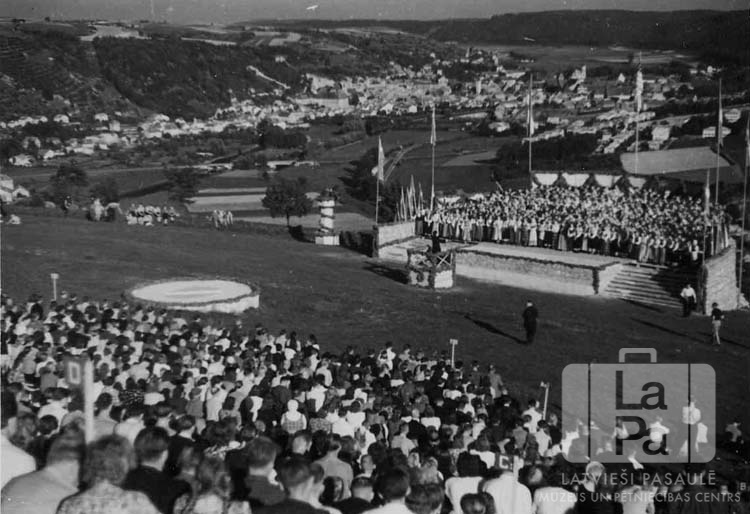 Franku novada dziesmu dienas Eihštetē (amerikāņu zonā). Skats no augšas pāri skatītāju rindām uz skatuvi, kurā dzied koris tautastērpos. Skatuves priekšā uz paaugstinājuma stāv diriģents. Apkārt skatuvei mastos ir karogi. Fonā ir pilsētas skats ielejā, ar zemiem kalniem apkārt. Fotogrāfijas mugurpusē rakstīts: "Eichštete."