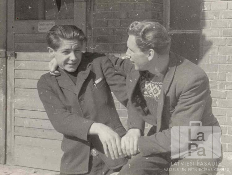 Jauneklis spēkojas ar pieaugušu vīrieti pie ķieģeļu mūra ēkas Ansbahā (amerikāņu zonā). Fonā ir ēkas durvis. Pirmais no kreisās: Vilmārs Strautiņš.