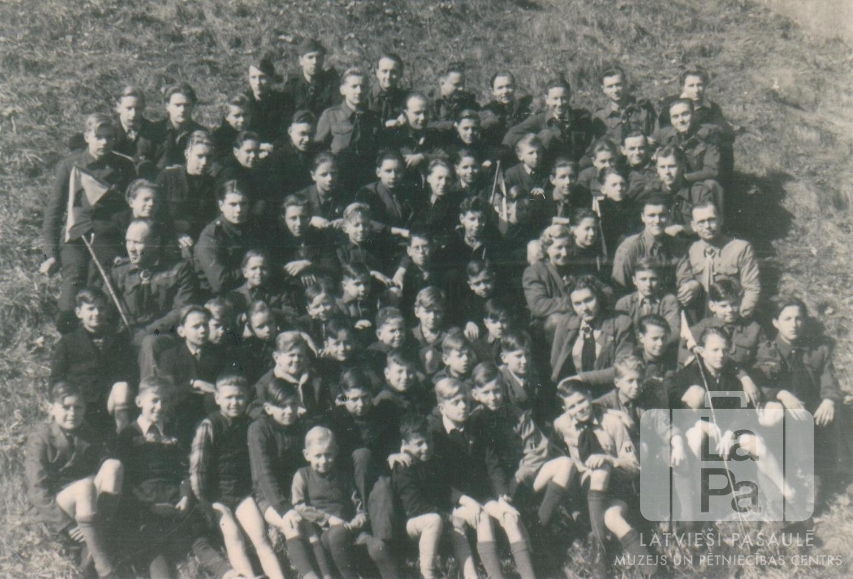 Staburaga 1. skautu vienība ar vadītājiem Lībekā (angļu zonā). Liela cilvēku grupa formastērpos sēž zālē uz nogāzes. Skats no augšas. Trešajā rindā, pirmais no labās: Jūlijs Medenieks.