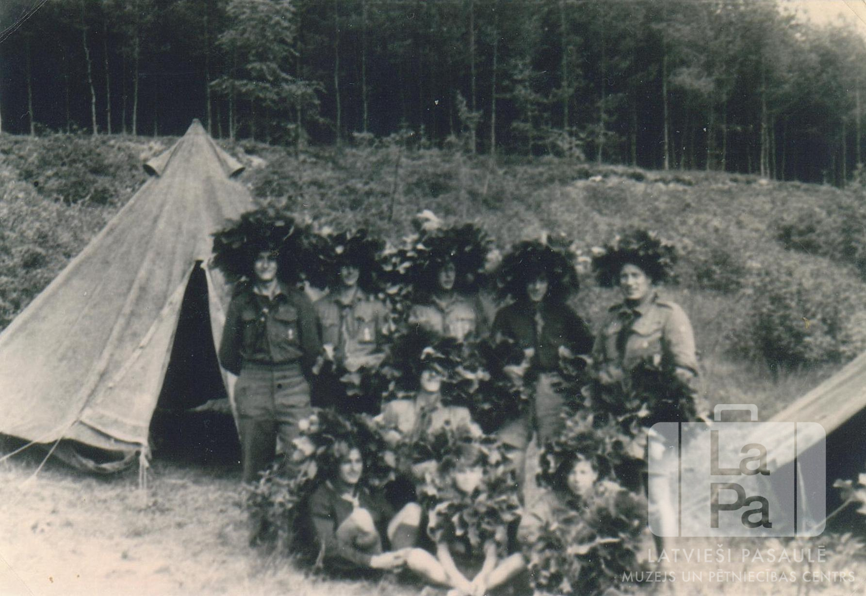 Staburaga 1. skautu vienības roveri no Lībekas (angļu zonā) Jāņu svētkos pie teltīm. Jauni vīrieši formastērpos un vainagiem galvās trīs rindās; pirmās divas rindas sēž uz zemes. Fonā ir mežs.