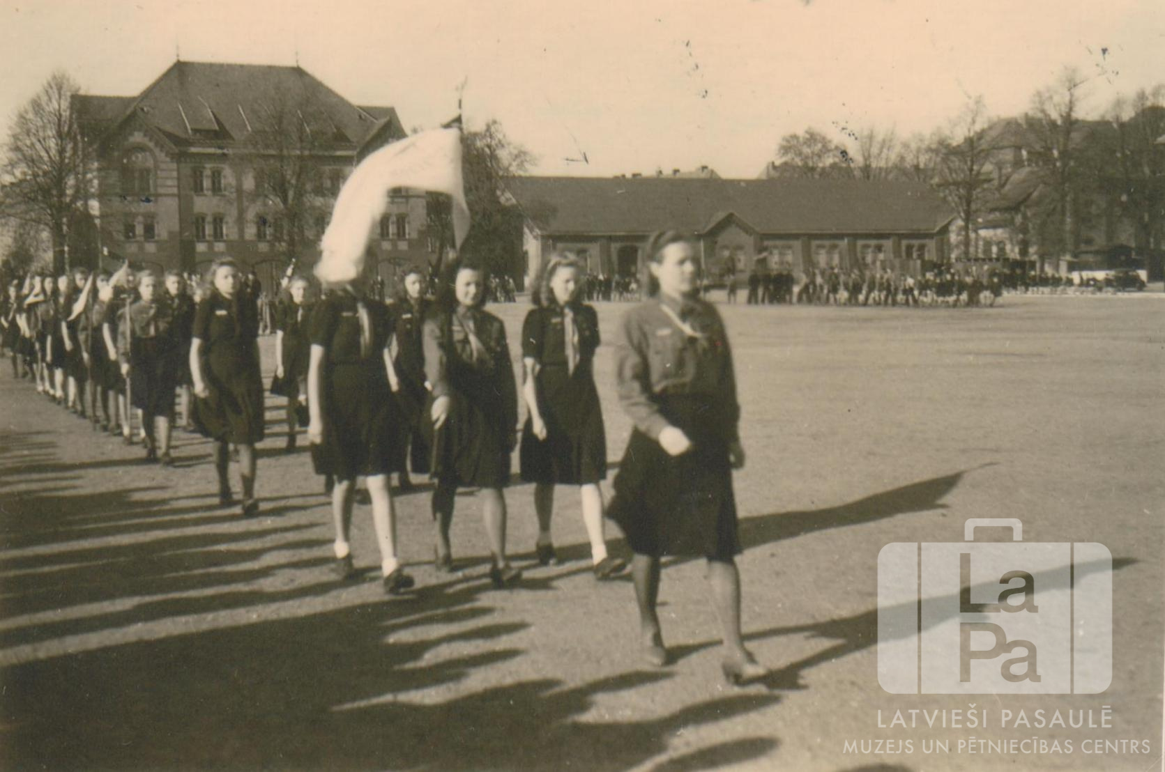 Liepavota 3. gaidu vienība no Mēsenes nometnes Lībekā (angļu zonā) Sv. Jura dienas parādē ap 1947. gadu. Skautu un gaidu parādē piedalījās Lībekas un apkārtnes skauti un gaidas. Jaunietes formastērpos soļo garā kolonnā; rindā aiz vadītājas jauniete vidū nes karogu. Fonā ir laukums un vairākas mūra ēkas, kuru priekšā ir cita cilvēku kolonna. Priekšā, pirmā no labās: Olga Medeniece (vadītāja).