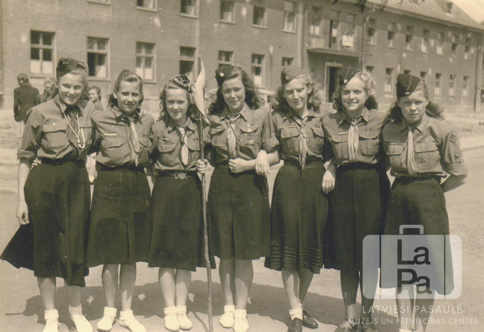 Liepavota 3. gaidu vienība no Lībekas (angļu zonā) formastērpos stāv laukumā. Septiņas jaunietes apķērušās stāv viena otrai blakus, vidū jauniete tur nūju ar mazu karogu. Fonā pie garas divstāvu mūra ēkas stāv meitenes. No kreisās: Vija Bangerska, Birute Mikus, Ilona Engels, Vija Blumfelde (pr. Mangule), Ilona Lūkina, Edīte Balode un Mirdza Eglīte.