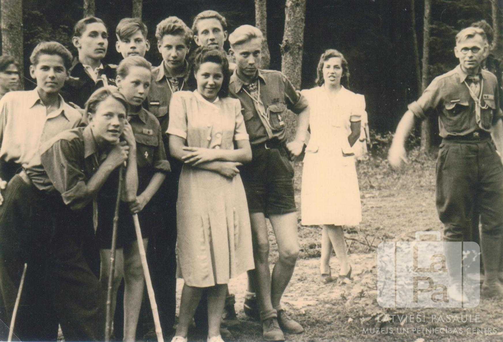 Fotogrāfijas dāvinātāja rakstītais atmiņu stāsts par bēgļu gaitām un bēgļu nometnēm: "Esmu dzimis 1931. gada 23. februārī Rūjienā. Dzīvoju Rīgā. Kad Padomju Savienības armija 1944. gada oktobrī tuvojās Rīgai, mēs ar vecākiem un māsu devāmies bēgļu gaitās uz Vāciju. Kara beigas sagaidījām Lībekā. Skautismam pievienojos 1946. gada 3. janvārī, iestājoties Vidzemes 1. apg. Gaujas novada Tālavas 7. skautu vienībā ar priekšnieku vadītāju Dēnavu. Skautu solījumu devu 1946. gada 10. martā. Kad 1946. gada rudenī Lībekas un tās apkārtnes latviešu bēgļu nometnes apvienoja, un mūs pārcēla uz Waldersee nometni. Tā bija blakus Lībekas lielākai latviešu bēgļu nometnei Mesen Kaserne. Tur darbojās latviešu skolas un skautu un gaidu vienības. 1946. gada rudenī pārgāju uz Staburaga 1. skautu vienību. Vienības priekšnieks bija vadītājs Jūlijs Mednieks. Esmu apstiprināts par Sācēja skautu 1946. gada 19. martā, Āra skautu 1946. gada 29. decembrī, Nometnes skautu 1948. gada 15. maijā, Sācēja roveri 1948. gada 15. augustā. Esmu izraudzīts par apakškopnieku 1946. gada 18. jūnijā, kopnieku 1947. gada 12. jūnijā. Gaujas novada Kopnieku Kursus beidzu Eutinā 1947. gada 20. jūlijā. Manas skauta gaitas izbeidzās, kad slēdza Lībekas Latviešu Ģimnāziju, un es līdz ar vairākiem ģimnāzistiem pieteicāmies Angļu Armijas pusmilitārā palīgdienastā ("melnajos"). Es dienēju transporta vienībā, kas bija piekomandēta pie Angļu Armijas Galvenā Štāba Rietumvācijā. Tur nodienēju līdz 1950. gada decembrim, kad mūsu ģimene saņēma atļauju ieceļot Amerikā. Tas ir cits stāsts."