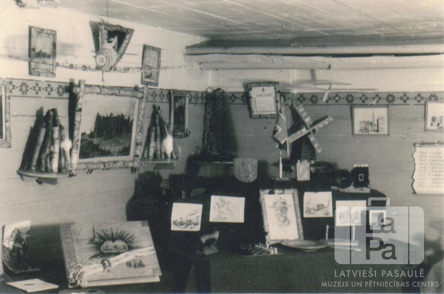 Staburaga 1. skautu vienības mītne 8. bloka pagrabā Mēsenes nometnē Lībekā (angļu zonā). Zīmējumi, attēli un rokdarbi zemas koka telpas telpas stūrī uz galdiem un pie sienas. Uz viena galda ir redzams Lielbritānijas karogs un mazas vējdzirnavas. Vairāki rāmji zīmējumiem ir veidoti no bērzu zariem.