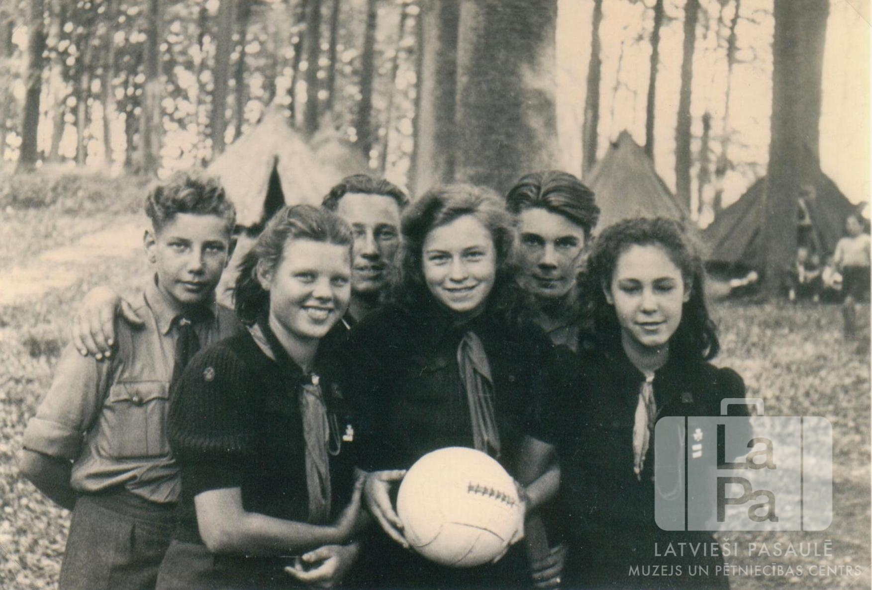 Lībekas (angļu zonā) Liepavota 3. gaidu un Staburaga 1. skautu vienību jauktā volejbola komanda ar volejbola bumbu mežā. Seši jaunieši formastērpos divās rindās; priekšā stāv jaunietes, aizmugurē stāv puiši. Fonā ir teltis un skauti. Priekšā, no kreisās: otrā ? Picane, trešā Aina Prauliņa. Otrajā rindā, no kreisās: Rolands Neijs, nezināms un Ilmārs Dzilna.