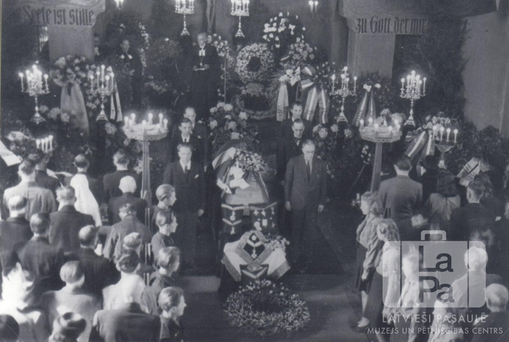 Pasniedzēja Jāzepa Vītola izvadīšanas svētbrīdis Lībekā baznīcā (angļu zonā). Pie aizvērta, ziediem klāta zārka vidū stāv seši vīrieši uzvalkos. Priekšplānā abās ejas pusēs godasardzē stāv skauti un gaidas formastērpos. Abpus ejai ir stāvošu bērinieku rindas. Telpas aizmugurē stāv mācītāji amata tērpos. Telpa ir dekorēta ar aizdegtām svecēm augstos svečturos un daudziem vainagiem, uz kuriem ir arī Latvijas Valsts karoga lentes. Skats no augšas.