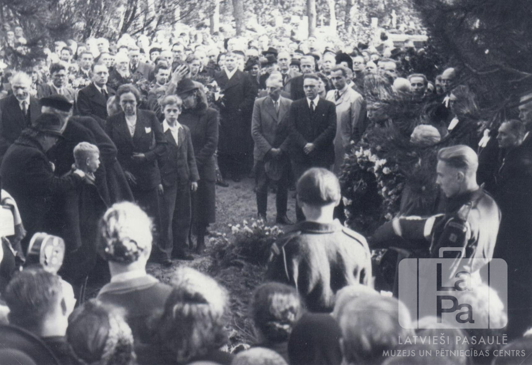 Pasniedzēja Jāzepa Vītola apglabāšana "Vorwerk" kapsētā Lībekā (angļu zonā). Liels izvadītāju pūlis stāv pie aizbērta kapa, uz kura ir nolikti ziedi. Apkārt ir koki. Priekšplānā labajā pusē ir redzams Staburaga 1. skautu vienības dižskauts Vilnis Balodis profilā (formastērpā, ar pasniedzēja apbalvojumu uz spilvena).