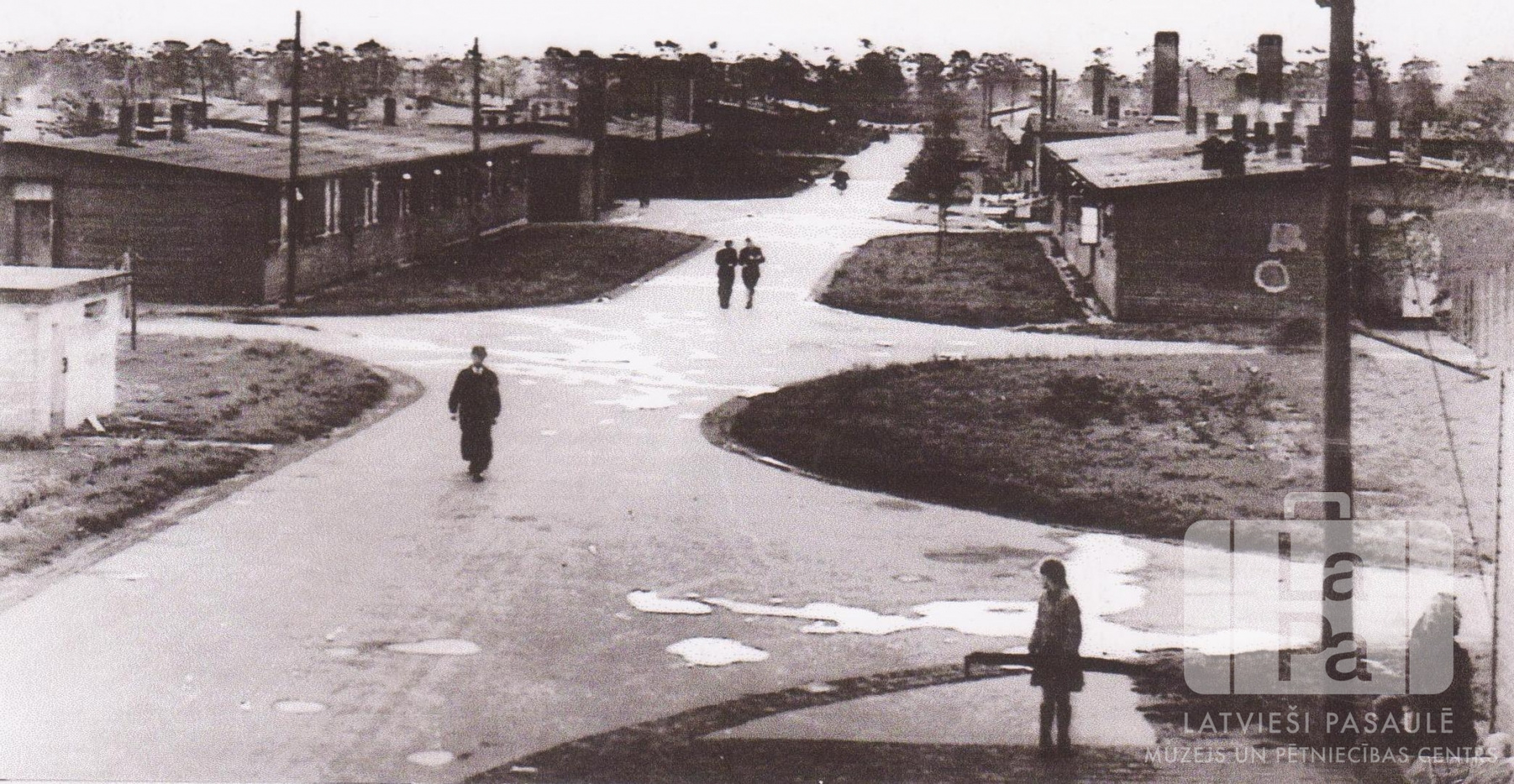 Iela ar gājējiem Antverpes nometnē Flensburgā (angļu zonā) 1947. gada ziemā. Priekšā redzams vīrietis mētelī un jauna meitene. Redzami vairāki krustojumi ar perpendikulārām ielām. Ielas abās pusēs ir vienstāvu koka barakas, no kuru skursteņiem kūp dūmi. Skats no augšas, no nometnes ieejas vārtu puses.