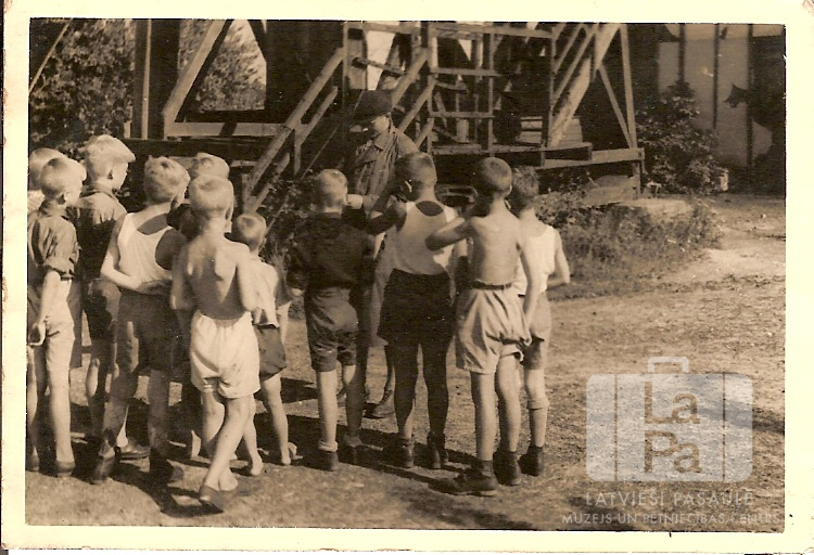 Mazskautu grupa šķēršļu gājienā pie ūdenstorņa Pinnebergas nometnē (angļu zonā). Zēnu grupa ar mugurām pret fotogrāfu. Aiz zēniem stāv vīrietis blakus koka (metāla ?) konstrukcijai.
