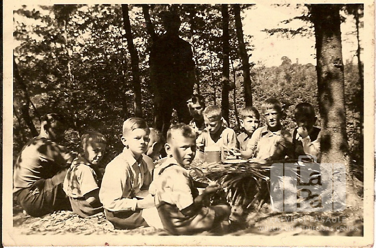 Mazskauti no Pinnebergas nometnes pusdienu laikā sēž ap paštaisītu galdu savā vasaras nometnē pie Iceho (angļu zonā). Mazskautu vadītāji, bijušie leģionāri, izraka galdu zemē un apklāja to ar zariem. Aizmugurē stāv vīrietis ēnā. Apkārt ir koki. Zēnu vidū ir redzami: Vitālijs Būcēns, Ivars Dāliņš, Kārlis Ābele jun., Daumants Būcēns un Guntis Bērziņš.