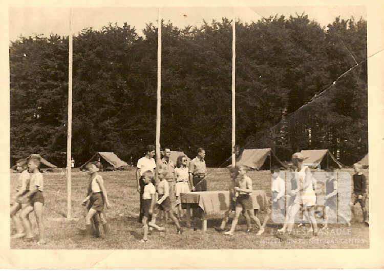Mazi skauti soļo garām trīs karogmastiem skautu džamborejā "Baden-Powell" nometnē Timmendorfā pie Lībekas (angļu zonā) 1948. gada vasarā. Mastiem priekšā, aiz galda, stāv trīs vīrieši un sieviete. Fonā ir telšu rinda meža malā. Pirmais no labās: Vitālijs Būcēns.
