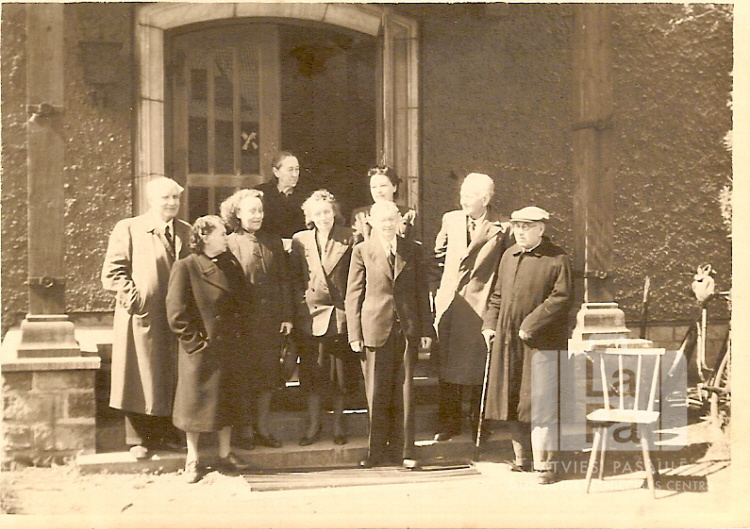 Cilvēku grupa mēteļos saulainā dienā stāv uz Sestā bloka dzīvojamās mūra ēkas ieejas kāpnēm Pinnebergas nometnē (angļu zonā). Cilvēki pārstāv bloka "inteliģenci". Labajā pusē ir koka krēsls un divritenis. Kreisajā pusē ir redzams Lapukinu pāris. Vidū ir redzams pasniedzējs ? Eglītis ar sievu Hertu. Labajā pusē ir redzami: ? Liepiņš un ? Šulcs. Aizmugurē, no kreisās: Līna Būcēna un Mirdza Būcēna.