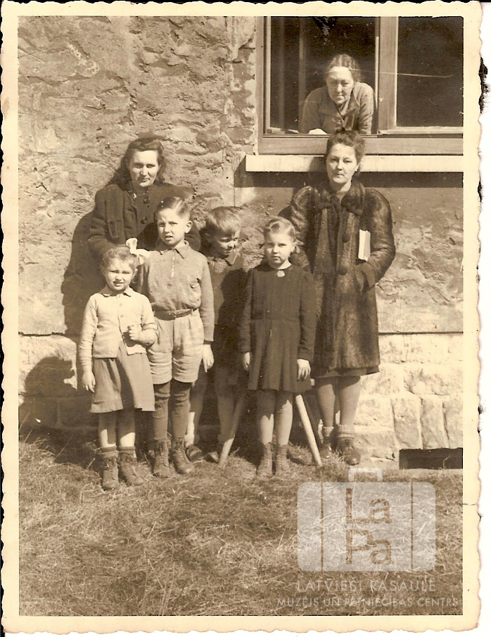 Būcēnu ģimene pie mūra ēkas Pinnebergas nometnē (angļu zonā). Divas sievietes un četri bērni ēkas ārpusē, vēl viena sieviete skatās pa ēkas pirmā stāva logu. Iespējams, ģimene stāv pie Otrā bloka dzīvojamās ēkas. Priekšā bērni, no kreisās: Ligita Maulica, Daumants Būcēns, Vitālijs Būcēns un Dzidra Rošāne. Aizmugurē sievietes: Vera Būcēna, Mirdza Būcēna un Līna Būcēna (logā).