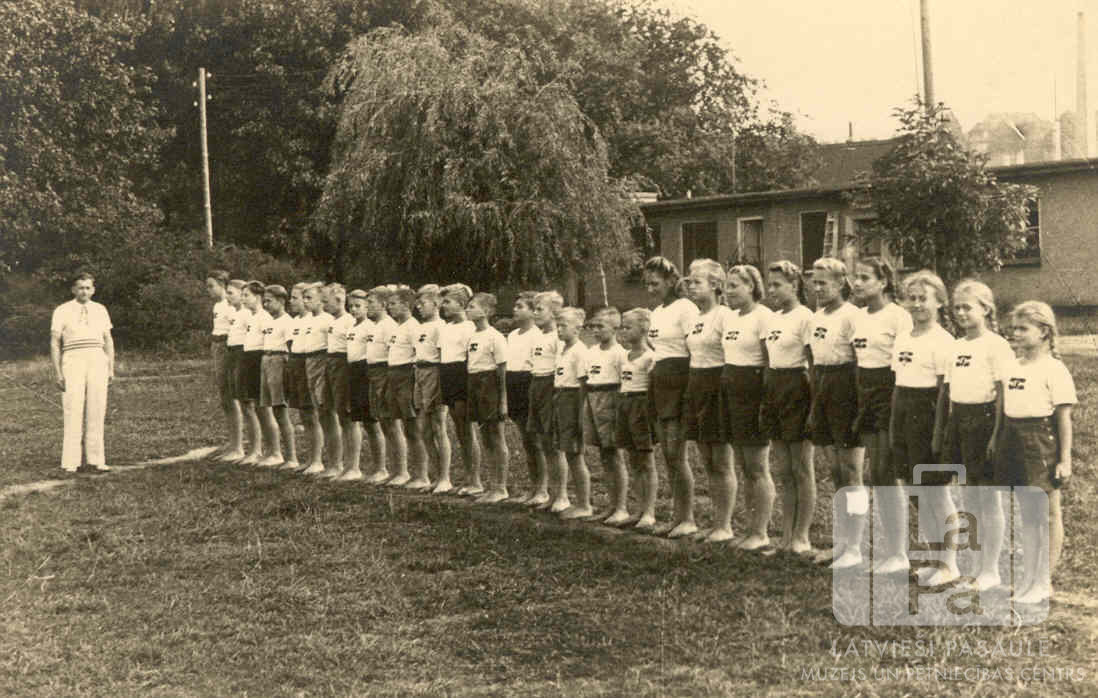 Vingrošana tautskolā Junkersa nometnē Kaselē (amerikāņu zonā) 1945.–1946. gadā. Zēni un meitenes pēc dzimumiem un augumiem un gaišos sporta kreklos un tumšos šortos stāv ierindā uz sporta laukuma līnijas. Kreisajā pusē stāv vadītājs gaišā apģērbā. Fonā ir mežs un vienstāvu ēka. No kreisās: Hugo Tērauds (skolas pārzinis), Uldis Rozenbergs, Gatis Plūme, Juris Kalve, Elmārs Vītoliņš, Valdis Vāgners, nezināms, nezināms, Heinrichs Puķīte, nezināms, nezināms, nezināms, Uldis Vipulis, nezināms, Valdis Vipulis, Uldis Vāgners, Aivars Reinerts, Harijs Miķelsons, Vitauts Vītoliņš, Silvija Meca, Maija Puķīte, nezināms, Inta Greize, Millija Lūsiņa, nezināms, Kačerovska, Mirdza Jēkabsone, Rota Tērauda un Vīta Terauda.