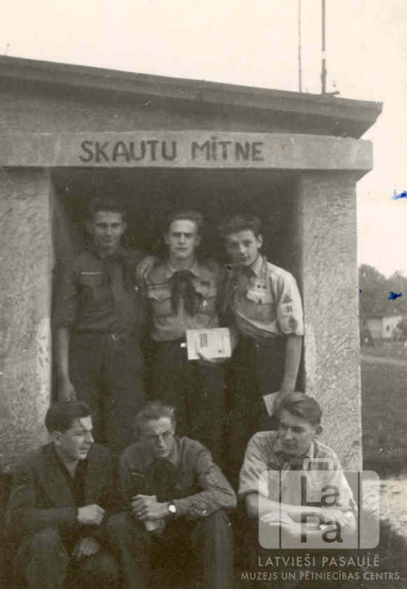 Burtnieku 71. skautu vienība formastērpos pie savas mītnes mūra ieejas Junkersa nometnē Kaselē (amerikāņu zonā) 1947.–1948. gadā. Trīs jaunekļi priekšā sēž, trīs stāv aizmugurē. Virs ieejas ir rakstīts: "SKAUTU MĪTNE". Priekšā, no kreisās: Juris Kalve, Uldis Rozenbergs un Gatis Plūme. Aizmugurē, no kreisās: Elmārs Vītoliņš, Valdis Vāgners un Heinrichs Puķīte.