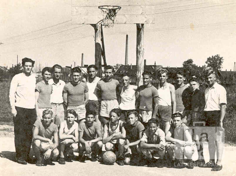 Divas basketbola komandas sacensību laikā Junkersa nometnē Kaselē (amerikāņu zonā) 1947. gada vasarā. Kaseles nometnes ģimnāzisti gaišos kreklos un Hānavas nometnes ģimnāzisti svītrainos kreklos stāv divās rindās pamīšus. Grupas priekšā ir basketbola bumba. Aizmugurē ir basketbola grozs. Fonā ir ēkas un skursteņi. Pirmajā rindā, no kreisās: otrais Gatis Plūme, ceturtais Eduards Puķīte un sestais Elmārs Vītoliņš. Otrajā rindā, pirmais no labās: Rūdolfs Junkulis (tiesnesis). Vēl otrajā rindā ir redzami (gaišos kreklos): ? Veverbrants, Gunārs Kociņš, ? Māliņš un Turaids Tiliks.