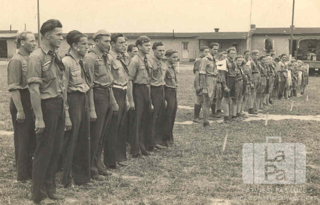 Burtnieku 71. skautu vienība dižskauti, skauti un mazskauti stāv parādes ierindā Junkersa nometnes laukumā Kaselē (angļu zonā) 1946. gada rudenī organizācijas "United Nations Relief and Rehabilitation Administration" pārstāvju viesošanās laikā. Skauti formastērpos stāv atsevišķās grupās. Fonā ir vienstāvu barakas.