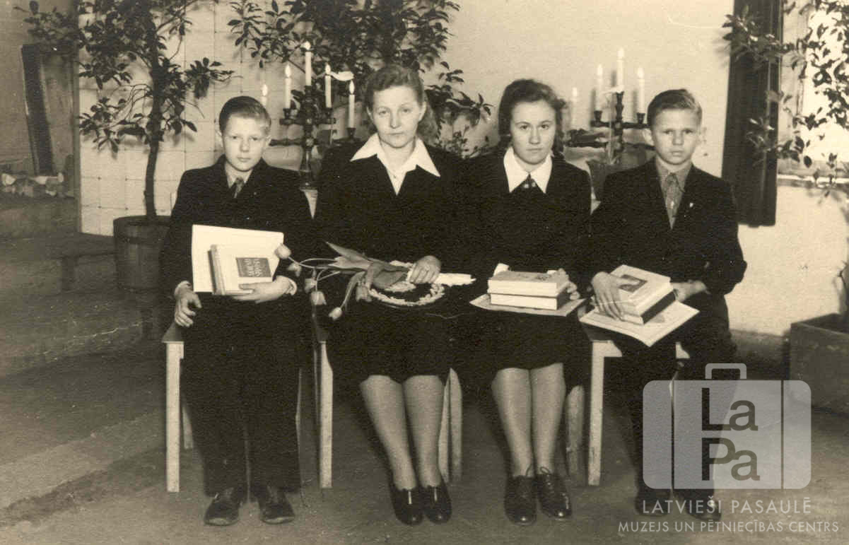 Trīs pēdējā pamatskolas izlaiduma absolventi ar klases audzinātāju Junkersa nometnē Kaselē (amerikāņu zonā) 1949. gada agrā pavasarī. Skolēni un skolotāja ar puķēm un grāmatām rokās sēž uz krēsliem iekštelpās. Fonā ir kāpnes, mazi, zemi koki podos un galds ar aizdegtām svecēm svečturos. No kreisās: Aivars Reinerts, Hermīne Reinerte (skolotāja), Mirdza Jākabsone (Jēkabsone ?) un Vitauts Vītoliņš.